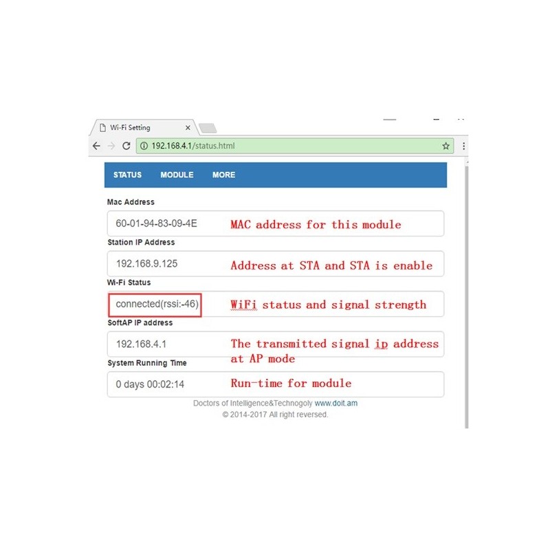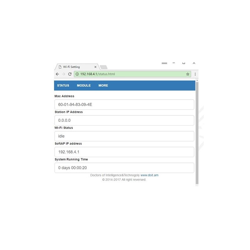 This module is already built-in the HTTP Server. Thus, it can configure the parameters by the browsers on PC or mobile phone or other smart devices, without of need of any other tools or Apps. In the factory settings, the module works in AP mode, and the signal is ‘Doit_WiFi_xxxxxx', where, ‘xxxxxx’ is the last 6 number of MAC address of this module. Then, one can connect this WiFi hotspot by PCs or phones, and other smart devices (supportable Android and Ios, Windows) with no password.