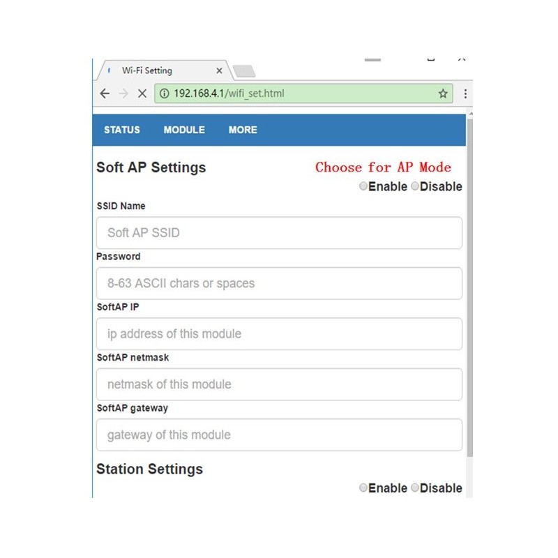 This module powers up as a standalone AccessPoint at DOIT_WIFI_XXXX with an IP address of 192.168.4.1. Any message sent to 192.168.4.1 on port TCP 9000 will be sent to TX/RX @ 9600bps and vice-versa.