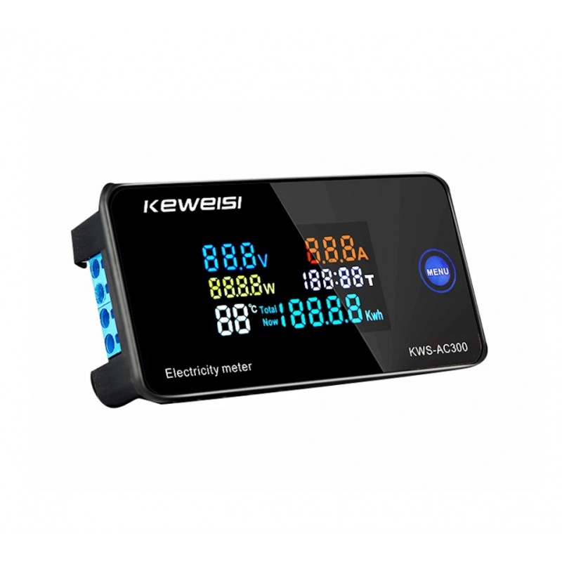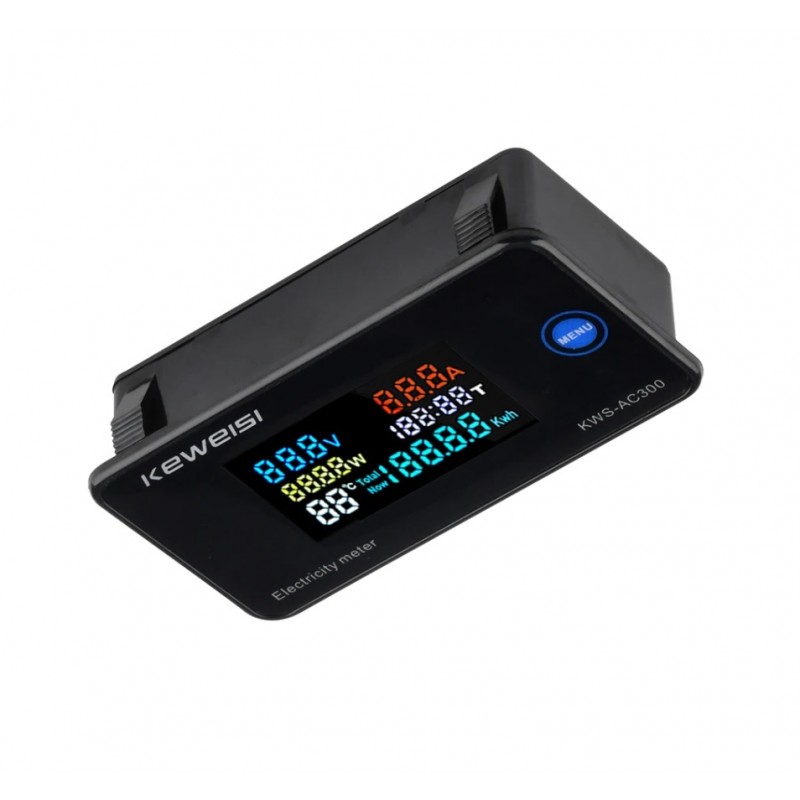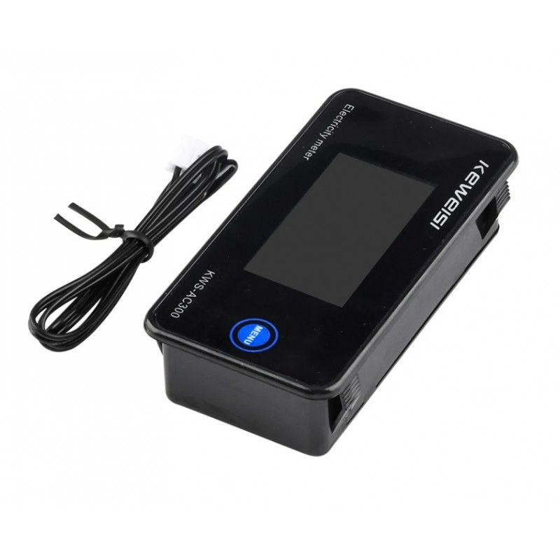 Paprastas įtaisas, rodantis tinklo parametrus, tokius kaip įtampa, naudojama srovė, naudojama galia, cosFi, suvartotas energijos kiekis, bendras suvartotas energijos kiekis, temperatūra, matavimo trukmė iki 200h